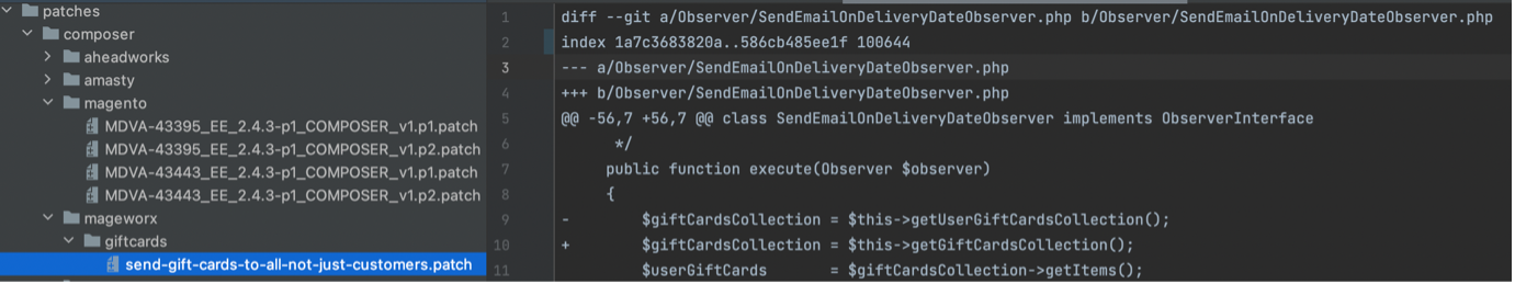 Example of a patch file applied to fix a serious gift card issue