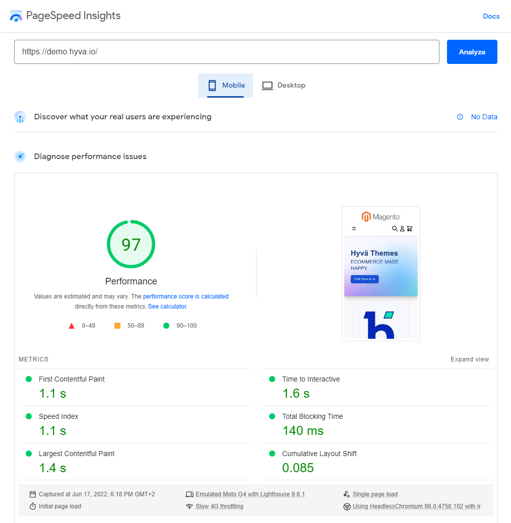 Mobile PageSpeed Insights for Hyvä demo website